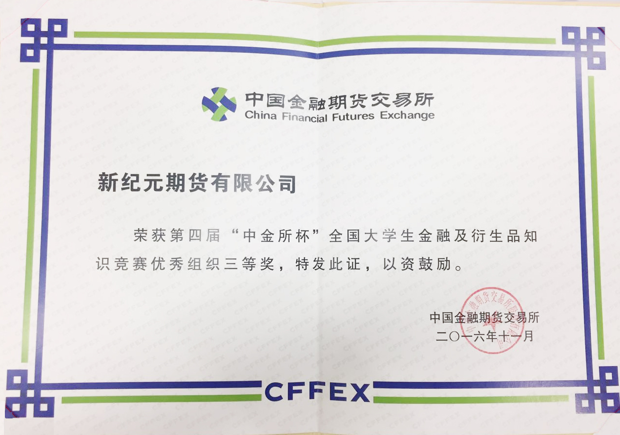 第四届“中金所杯”全国大学生金融及衍生品知识竞赛圆满结束,共1120所境内外高校参赛,近2.7万名在校大学生报名,924名学生获奖。作为本次大赛的承办单位,新纪元期货股份有限公司获得优秀组织奖三等奖。
