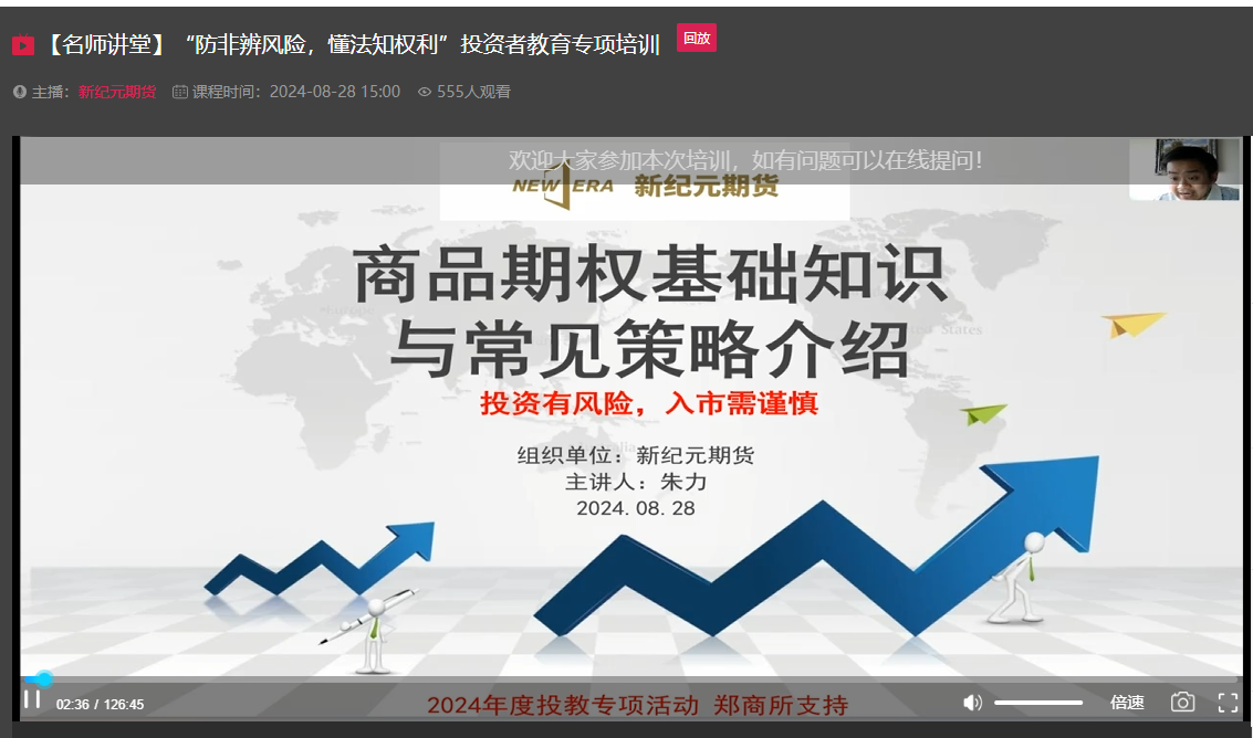 为进一步提升广大投资者和期货交易者的期货、期权知识水平和风险防范意识,新纪元期货于2024年8月28日成功举办了“防非辨风险,懂法知权利”投资者教育线上专项培训活动。