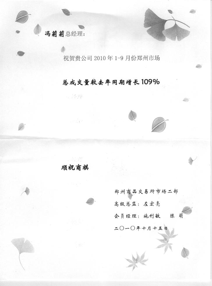 公司2010年1-9月郑州市场总成交量较去年同期增长109%