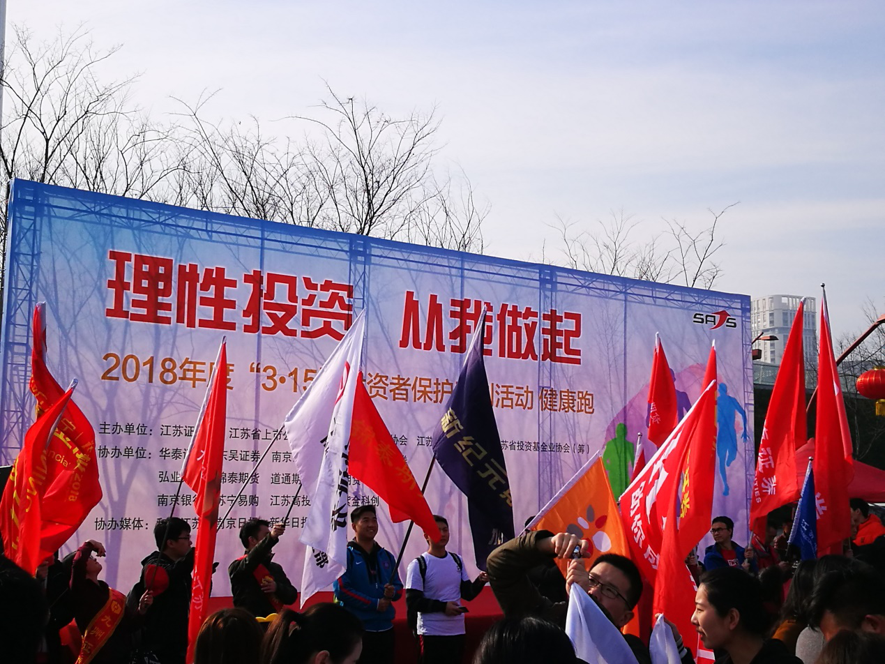 2018年3月11日,“理性投资、从我做起—— ‘3·15’投资者保护健康跑”活动在南京举行,活动由江苏证监局、江苏省期货业协会、江苏省证券业协会、江苏省投资基金业协会(筹)主办,江苏证监局凌峰副局长等领导出席。