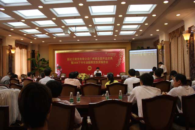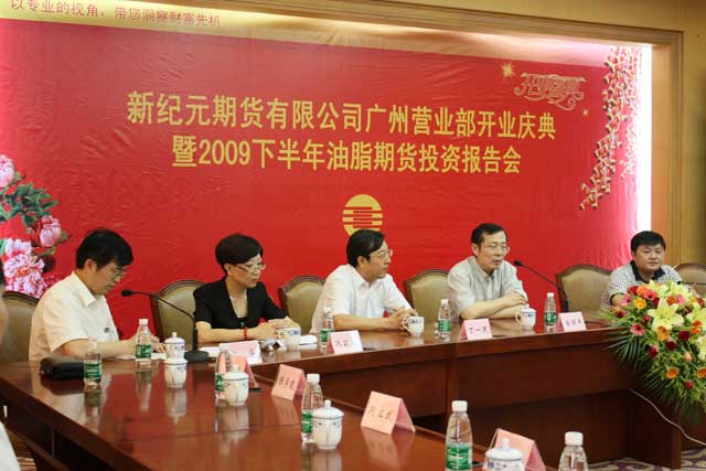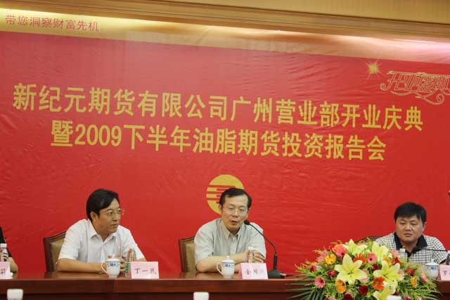 2009年7月18日下午两点,由大连商品交易所主办、新纪元期货公司协办的2009下半年油脂期货投资报告会在广州市东风大酒店成功举行。广东证券期货业协会秘书长金国燕、大连商品交易所驻广州办事处罗俊伟、香港骏溢期货公司董事长潘国华、新纪元期货有限公司董事长丁一民、总经理冯莉莉、常务副总郑华等出席了报告会。