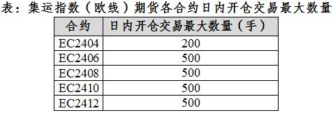 根据《上海国际能源交易中心风险控制管理细则》的有关规定,经研究决定,自2023年12月25日(周一)交易起,非期货公司会员、境外特殊非经纪参与者、客户在集运指数(欧线)期货合约日内开仓交易的最大数量如下。