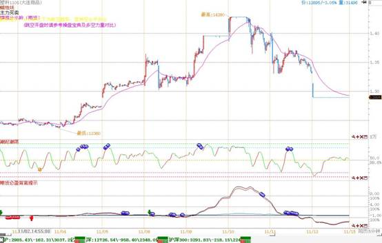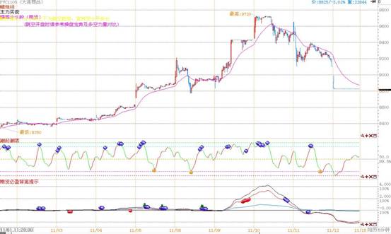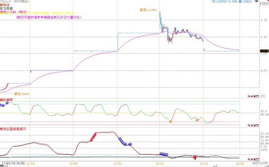 5分钟必盈三线也是自高点回落,同在11月11日盘中穿越0轴,且出现短期怀背离,对应潮起潮落高位,给出空头进场信号,目前显示LLDPE主力资金出逃明显,且仍没有回补迹象,短期内后市不宜乐观,仍应空头为主。