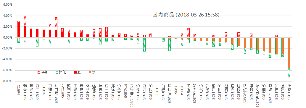 4.地缘政策风险和中美贸易战的升级对油价形成压力,原油期货上市首日高开低走。化工品PTA持续抗跌,塑料破位后延续跌势。沪胶受贸易战及自身供需面影响,延续跌势。