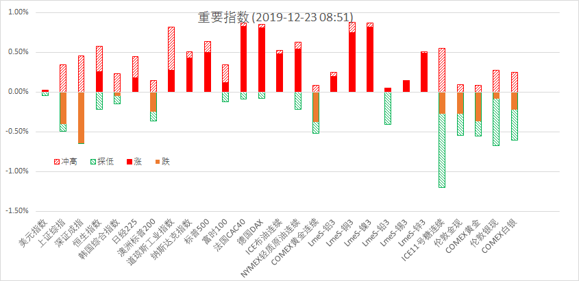 12月20日周五,美股标普500指数涨0.49%;欧洲Stoxx50指数涨0.90%;美元指数涨0.30%;WTI原油跌1.18%;Brent原油跌0.69%;伦铜跌0.69%;黄金跌0.02%。美豆涨0.28%;美豆粕跌0.26%;美豆油跌0.09%;美糖跌0.07%;美棉涨0.32%;CRB指数跌0.04%,BDI指数跌2.43%。离岸人民币CNH升0.01%报6.9985;焦炭涨0.03%,铁矿石涨1.17%,螺纹钢涨0.74%。