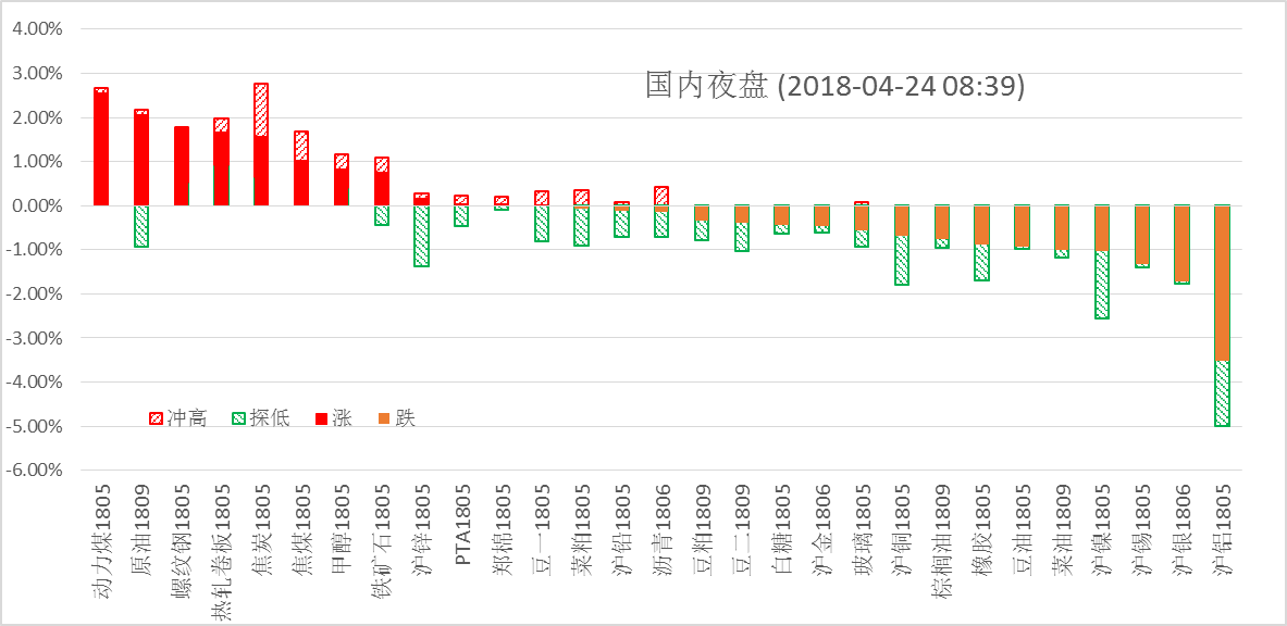 周一夜盘,标普跌0.01%;道指跌0.06%;欧洲Stoxx50指数涨0.50%;美元指数涨0.67%;伦铜跌0.79%;原油涨0.76%;黄金跌0.87%。美豆跌0.87%;美豆粉跌0.63%;美豆油跌1.05%;美糖跌4.21%;美棉跌0.45%;CRB指数跌0.54%;BDI指数涨1.95%。离岸人民币CNH跌0.47%报6.3083;大连焦炭1809涨1.98%,大连铁矿石1809涨0.95%,上海螺纹钢1810涨1.14%,