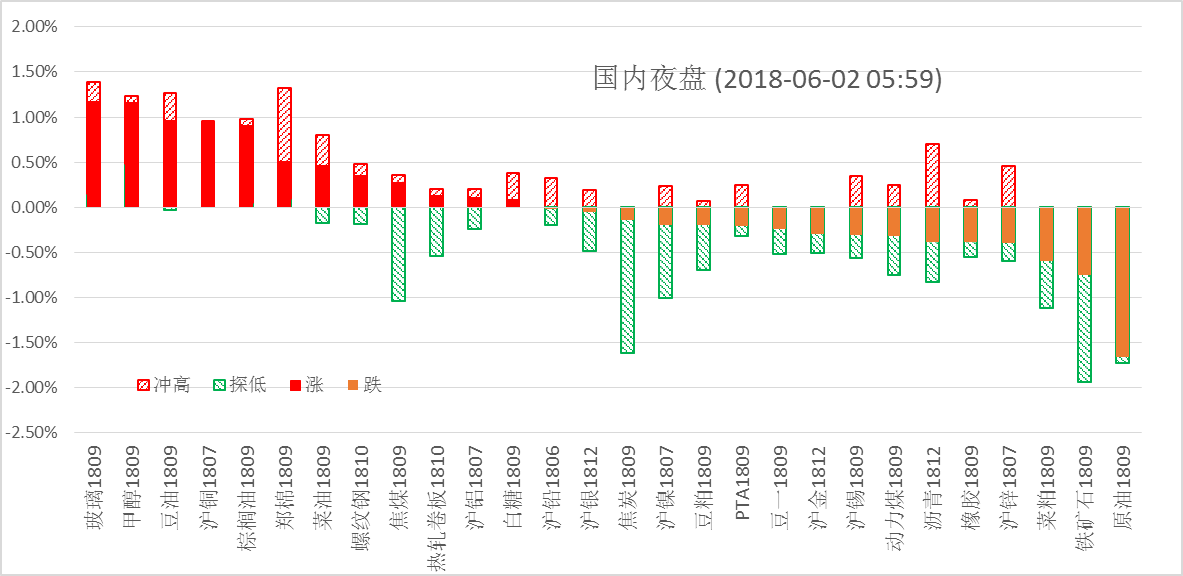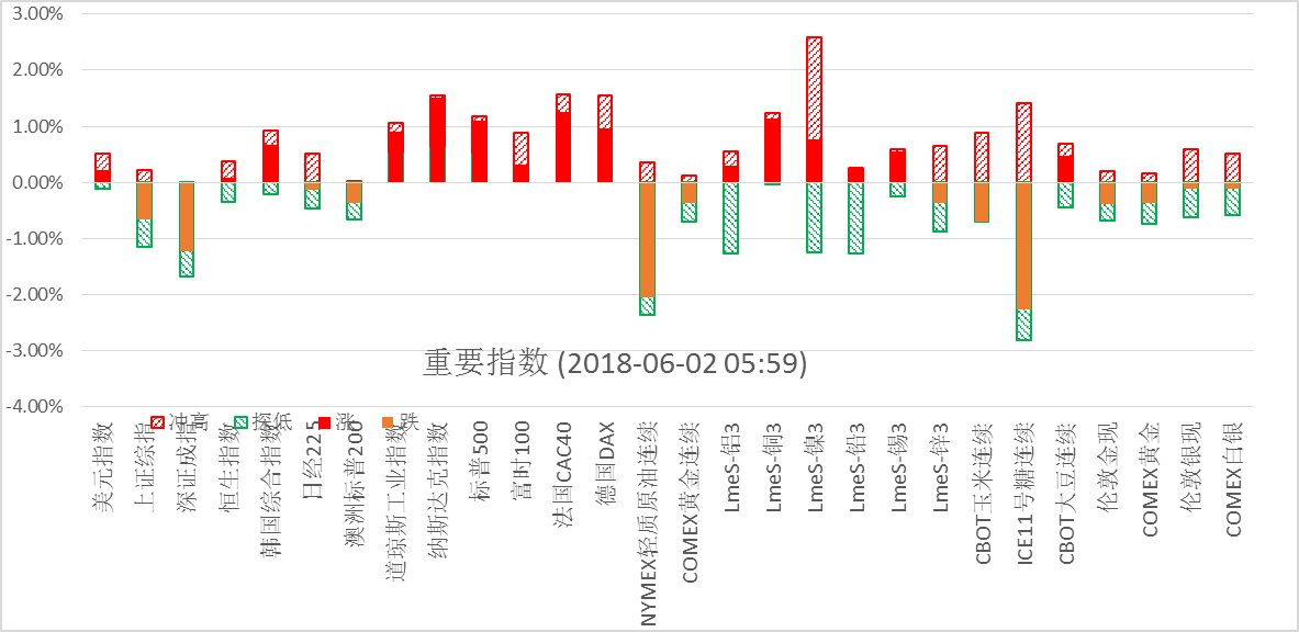 周五夜间, 标普涨1.08%;道指涨0.90%;欧洲Stoxx50指数涨1.24%;美元指数涨0.22%;伦铜涨1.12%;WTI原油跌1.98%;CME黄金跌0.52%。美豆涨0.55%;美豆粉跌0.13%;美豆油涨0.35%;美糖跌2.27%;美棉涨1.07%;CRB指数跌0.56%;BDI指数涨6.06%。离岸人民币CNH贬0.08%报6.4144;大连铁矿石1809跌0.75%,大连焦炭1809跌0.14%,上海螺纹钢1810涨0.35%,上海原油1809跌1.66%。