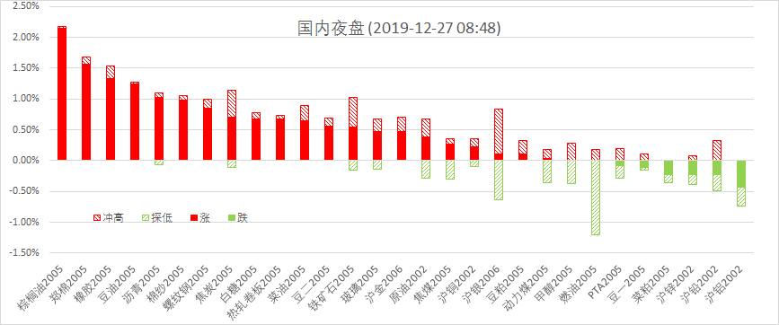 总结:年末风险因素出清,中美经贸磋商利好消息及报告预测美国原油库存上周环比下降,进一步推高市场乐观情绪,经历盘跌休整后,多数工业品形成普涨。