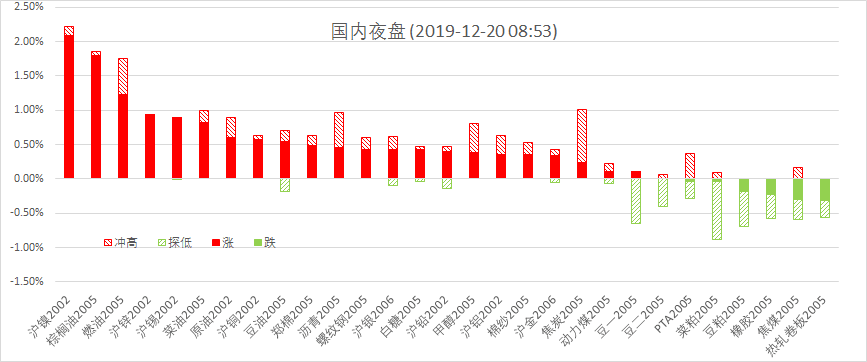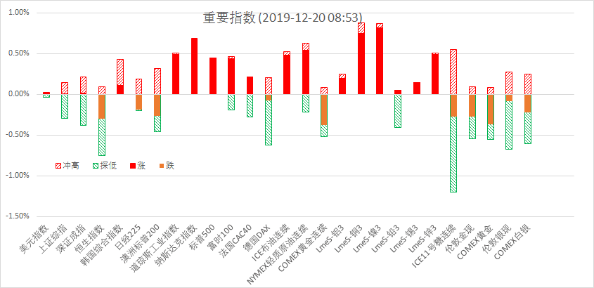 12月19日周四,美股标普500指数涨0.45%;欧洲Stoxx50指数跌0.06%;美元指数涨0.01%;WTI原油涨0.46%;Brent原油涨0.63%;伦铜涨0.50%;黄金涨0.22%。美豆跌0.24%;美豆粕跌1.24%;美豆油涨1.26%;美糖涨1.04%;美棉涨1.41%;CRB指数涨0.11%,BDI指数跌5.73%。离岸人民币CNH升0.02%报6.9994;焦炭涨0.24%,铁矿石跌0.39%,螺纹钢跌0.43%。