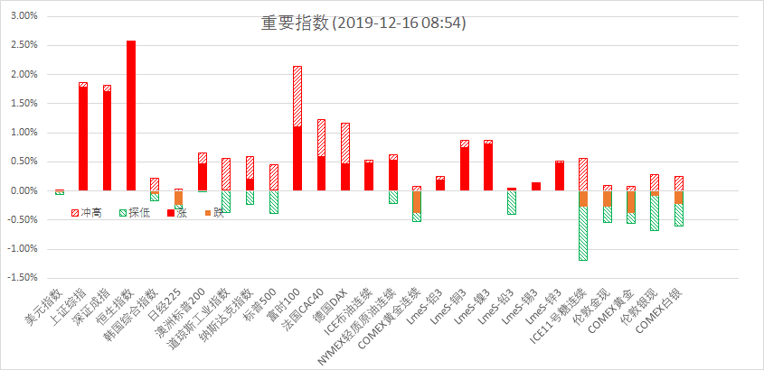 12月13日周五,美股标普500指数涨0.01%;欧洲Stoxx50指数涨0.60%;美元指数跌0.06%;WTI原油涨0.95%;Brent原油涨0.79%;伦铜跌0.30%;黄金涨0.42%。美豆涨1.00%;美豆粕涨0.78%;美豆油涨1.18%;美糖跌0.30%;美棉跌0.76%;CRB指数涨0.49%,BDI指数跌2.38%。离岸人民币CNH贬0.94%报7.0029;焦炭涨0.30%,铁矿石涨1.08%,螺纹钢涨0.26%。