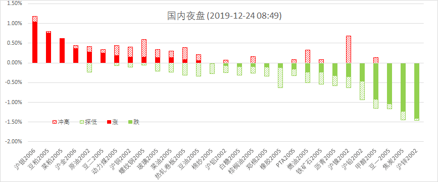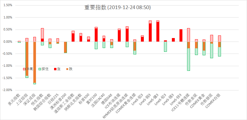 12月23日周一晚,美股标普500指数涨0.09%;欧洲Stoxx50指数涨0.04%;美元指数跌0.02%;WTI原油涨0.46%;Brent原油涨0.62%;伦铜涨0.06%;黄金涨0.50%。美豆涨0.54%;美豆粕涨0.99%;美豆油跌0.44%;美糖跌0.52%;美棉涨0.82%;CRB指数跌0.30%,BDI指数跌1.78%。离岸人民币CNH贬0.15%报7.0087;焦炭涨跌1.23%,铁矿石跌0.23%,螺纹钢涨0.14%。
