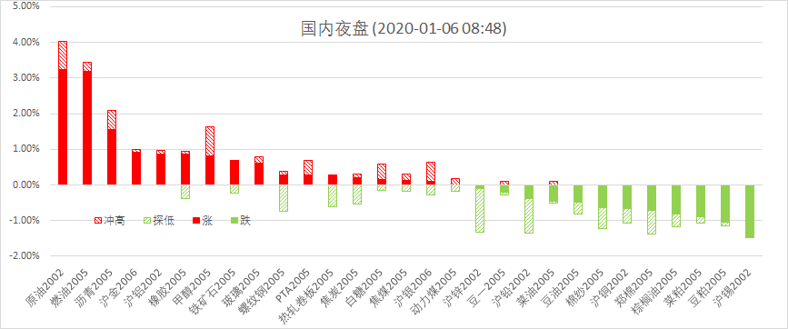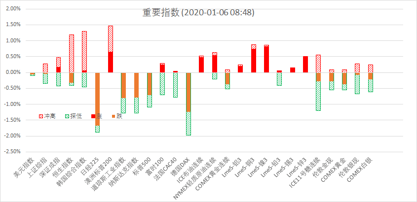 1月3日周五夜盘,美股标普500指数跌0.71%;欧洲Stoxx50指数跌0.69%;美元指数涨0.07%;WTI原油涨3.04%;Brent原油涨3.56%;伦铜涨0.62%;黄金涨1.54%。美豆跌1.49%;美豆粕跌1.31%;美豆油跌0.54%;美糖涨1.22%;美棉涨0.03%;CRB指数涨0.73%,BDI指数跌6.29%。离岸人民币CNH贬0.04%报6.9647;焦炭涨0.21%,螺纹钢涨0.28%,铁矿石涨0.68%,国内原油涨2.66%。