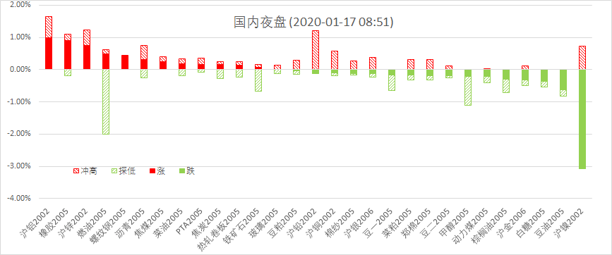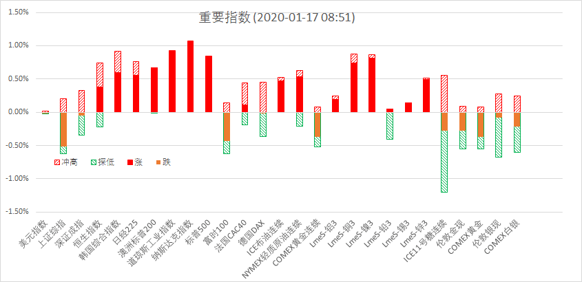 1月16日周四夜盘,美股标普500指数涨0.84%;欧洲Stoxx50指数涨0.09%;美元指数涨0.08%;WTI原油涨0.90%;Brent原油涨0.62%;伦铜跌0.52%;黄金跌0.28%。美豆跌0.54%;美豆粕涨0.13%;美豆油跌0.90%;美糖跌0.83%;美棉涨0.09%;CRB指数跌0.24%,BDI指数涨0.00%。离岸人民币CNH升0.18%报6.8784;焦炭涨0.16%,螺纹钢涨0.42%,铁矿石涨0.08%,国内原油涨0.87%。