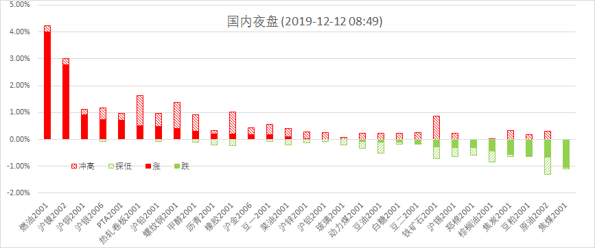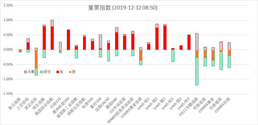 12月11日周三夜盘,美股标普500指数涨0.29%;欧洲Stoxx50指数涨0.50%;美元指数跌0.36%;WTI原油跌0.49%;Brent原油跌0.55%;伦铜涨0.86%;黄金涨0.72%。美豆跌0.89%;美豆粕跌1.31%;美豆油跌0.73%;美糖跌0.59%;美棉跌0.11%;CRB指数跌0.37%,BDI指数跌4.45%。离岸人民币CNH贬0.02%报7.0277;焦炭跌1.05%,螺纹钢跌0.14%,铁矿东跌0.77%,国内原油跌0.66%。