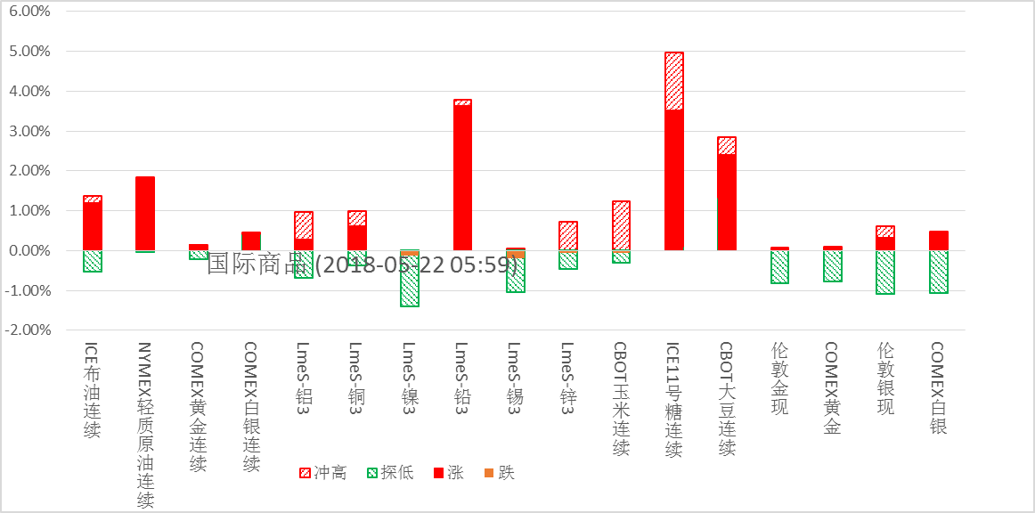 周一夜间,标普涨0.74%;道指涨1.21%;欧洲Stoxx50指数跌0.53%;美元指数跌0.12%;伦铜涨1.09%;原油涨1.81%;黄金涨0.05%。美豆涨2.40%;美豆粉涨0.58%;美豆油涨1.45%;美糖涨3.52%;美棉涨2.36%;CRB指数涨0.99%;BDI指数跌2.67%。大连铁矿石1809跌0.32%,大连焦炭1809跌0.02%,上海螺纹钢1810跌0.22%,上海原油1809涨0.44%。