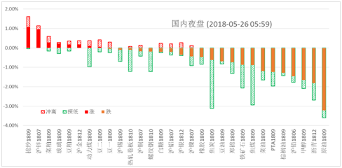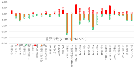 周五夜间,标普跌0.24%;道指跌0.24%;欧洲Stoxx50指数跌0.21%;美元指数涨0.49%;伦铜跌0.76%;WTI原油跌4.54%;黄金跌0.25%。美豆涨0.60%;美豆粉涨0.90%;美豆油跌1.26%;美糖涨0.57%;美棉涨2.09%;CRB指数跌1.13%;BDI指数跌2.89%。离岸人民币CNH贬0.19%报6.3892;大连铁矿石1809跌0.87%,大连焦炭1809跌0.62%,上海螺纹钢1810跌0.2%,上海原油1809跌3.23%。