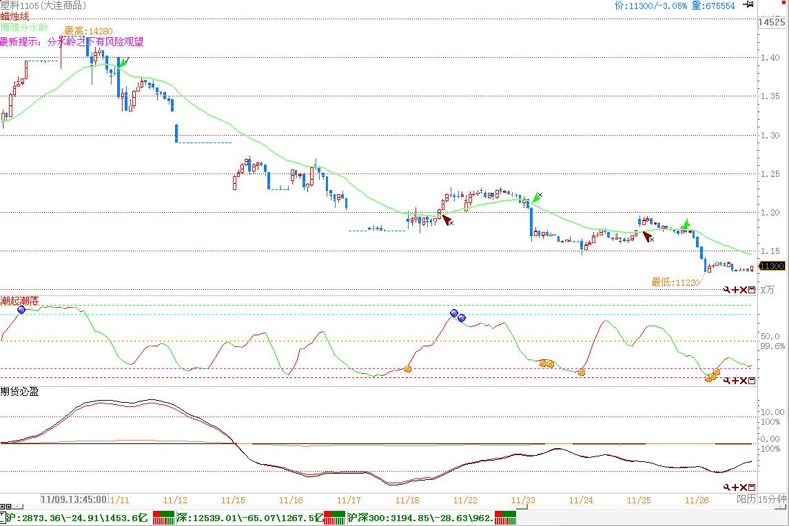 塑料15分钟必盈三线依然徘徊于零轴之下,虽然上周五盘中略有上翘,但力度有限,空头控盘迹象明显,典型空头市场特征,短期仍以逢潮起潮落高位沽空为主,中线暂时观望。