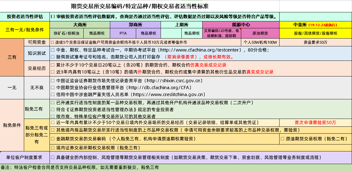 修订后,凡是已具有境内交易所实施适当性制度的任一期货、期权品种交易权限的客户,在开通期权或者特定品种交易权限时,可以豁免适当性评估的“三有”(有知识、有交易经历、有资金)要求。