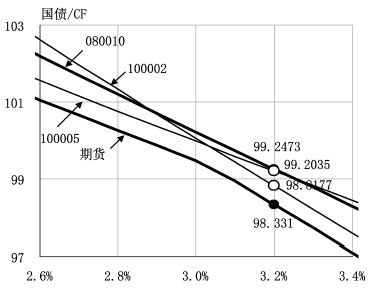 到了2013年3月8日,也就是期货的最后交易日,市场的收益率仍然维持3.2%的水平,则国债080010的净价是105.8431元,期货净价98.686元。