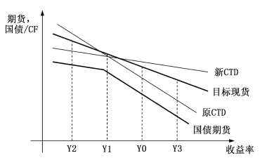 当市场收益率在Y1以下波动时,CTD发生改变,期货的修正久期与目标现货的修正久期之间的关系发生变化,ΔB和ΔF的关系也发生改变。此时,久期较小的券成为CTD,期货跟随新的CTD价格变化,对收益率的敏感性降低,因此ΔF2会小于ΔB2,则ΔB2大于ΔF2×K,出现套保不足。