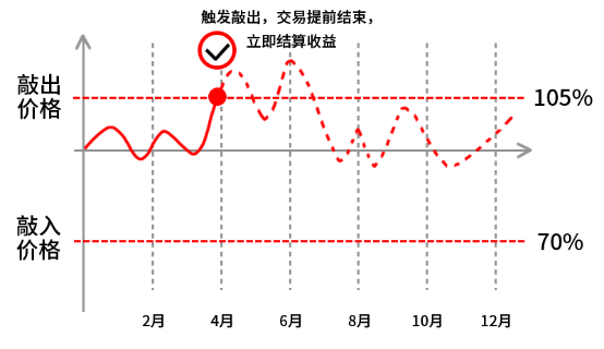 损益情形一、只触发敲出事件。假设产品在第4个月的敲出观察日,中证500指数为7370点,超过7350点的敲出价格,触发敲出事件,则产品提前结束。投资者共持有产品4个月,获得1000000*18%*(4/12)=60000元的收益。如下图所示: