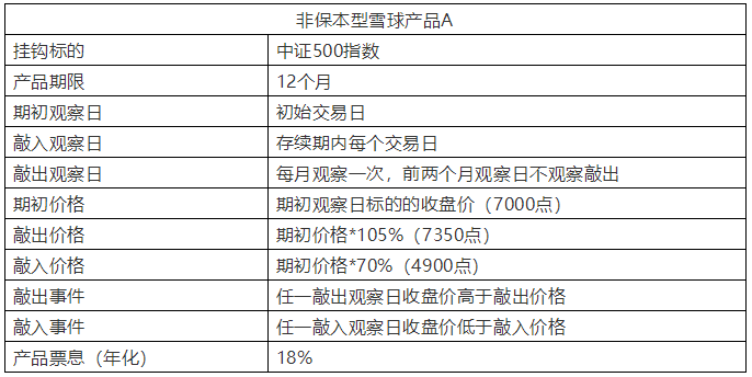 二是产品到期时,中证500指数低于期初7000点的初始价格,则投资者需要承担本金损失。下图以常见的非保本型雪球产品为例,产品结束时中证500指数相较期初下跌5%,投资者需要承担1000000*5%=50000元的本金损失。