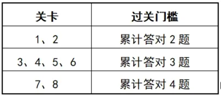 (3)当用户答对的题目数≥过关门槛则闯关成功,获得相应权益值并计入权益值排行榜。如用户挑战关卡失败,则该关权益值清零,失败关卡支持重复挑战。过关门槛具体如下: