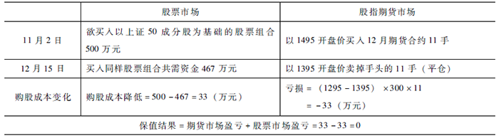 (5)结束套保。12月15日资金到达股票账户,价值500万元的股票组合建仓完毕同时,将原先买入的11手期货合约以均价1695点卖出平仓。