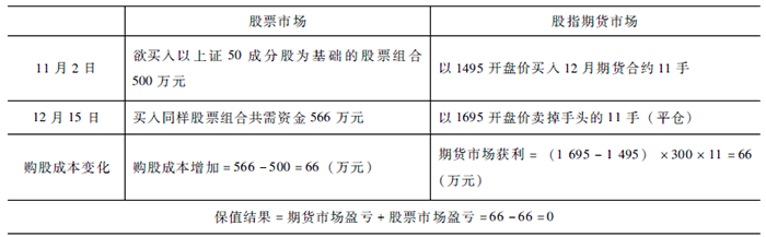 “当投资者的购股资金在途或打算在未来某个时间买入一个股票组合时,现在股票账户上尚未有购股资金,而该投资者预期股市短期内会上涨,时不我待,怎么办?为了防止到时购入股票时因股票价格上涨而多支付购买成本,可以先在股指期货市场买入与欲买的股票组合价值相当的股指期货合约,以锁定实际购买股票的成本。如果到时执行买入股票操作时股票价格上涨了,股票交易将会比按期初价格支付更多成本,但是在期货市场上的交易会获得盈利,从而弥补多支付的购股成本,使股票组合的实际购买成本锁定在期初价格水平;相反,如果到执行买入股票操作时,股票价格下跌,股票交易支付的价格会比期初价格低,但在期货交易上出现亏损,从而抵消股票价格下跌给股票交易带来的好处,使实际购股成本仍处于期初的水平。这种做法称为买入套期保值,通常为资金较为紧张的投资者采用。”